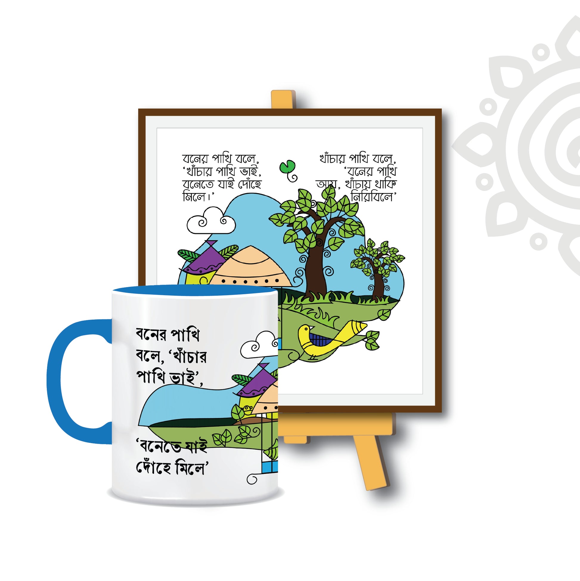 Combo Deal | Khanchar Pakhi | Style #2 | Set of 2 - Framed Art with stand & Coffee Mug